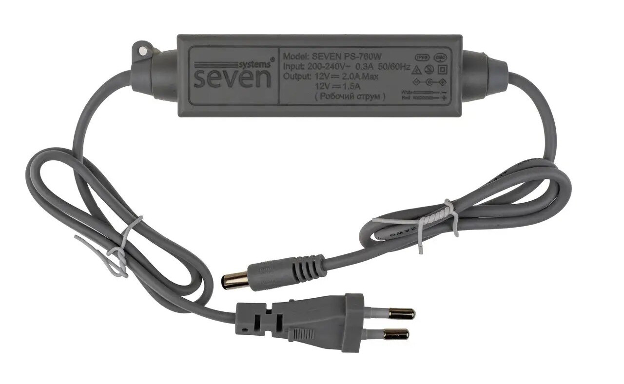 Адаптер живлення 12 В/2 А SEVEN PS-760W SEVEN PS-760W — це пристрій, призначений для формування напруги, необхідної системі, з напруги електричної мережі. ОСОБЛИВОСТІ БЛОКА ПІТАННЯ 12В/2А SEVEN PS-760W: Імпульсне джерело живлення. Вологостійкий IP66. Адаптерного (закритого) типу. Пластиковий корпус. Мережевий шнур із виделкою в розетку. Блоки живлення PS-760W пройшли додаткове тестування LVD і EMC safety standard. Захист вхідної напруги, захист від перенапруги, захист від короткого замикання, індикація вхідної напруги. ТЕХНІЧНІ ХАРАКТЕРИСТИКИ: Вхідна напруга 110-240 В. Вихідна напруга 12 В. Сила струму на виході 2 А (24 Вт). З роз’ємом живлення 12 В. Габарити: 126*28*28 мм. Компанія SEVEN Systems упродовж 5 років займає лідерські позиції на ринку обладнання за системами контролю доступу, а зокрема за автономними рішеннями. Щорічно є учасниками в профільових виставках, як-от Expert Security та IntrererBuildExpo.