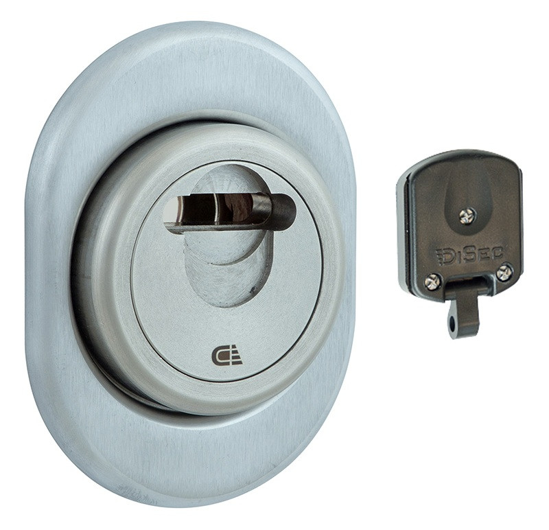 DISEC MAGNETIC 3GDM LEVER KEY OVAL 15 мм 3 клас 3 магнітних ключа хром матовий • Специфікація фурнітури – 3GDM. • Тип замку – LEVER_KEY. • Обробка фурнітури – хром матовий. • Клас зламостійкості – 3 клас. • Товщина броні -15 мм. Захисний протектор моделі 3GDM, з магнітним ключем призначений для захисту сувальдного механізму від злому. Захисна шторка броненакладки додатково захищає ключовий отвір від попадання сторонніх предметів, вандалізму, підбору відмичок. Основні кріпильні отвори броні – 18 мм, що є стандартом замків CISA. Виробник – DISEC (Італія). Матеріал – нержавіюча сталь. Габаритні розміри – товщина 15 мм, d – 50 мм Кріплення – гвинти М4х45мм 2шт. Спеціальна форма і матеріал гвинтів кріплення М4 витримують до 1200 кг на злам. Магнітні ключі – 3 шт, кодова картка. Обробка – хром матовий. Має матову поверхню, оброблену щіткою, сріблясто-сірого кольору. Краще виглядає на дверях червонуватих відтінків – від світлого кремового до темно-коричневого шоколадного. Для інтер’єрів у сучасних та класичних стилях. DiSec — італійська компанія, заснована 2000 року. Займається виключно виробництвом захисної фурнітури. Така вузька спеціалізація дає змогу розробляти і постійно вдосконалювати нестандартні та оригінальні засоби захисту дверних замків. До нововведень цього виробника можна віднести використання елементів броненакладки із загартованої сталі, а також можливість приховати отвір для ключа під час Вашої відсутності. Завдяки зносостійкому багатошаровому гальванічному покриттю, продукція DiSec встановлюється на вхідні двері та стійка до атмосферних явищ. Об’єднання магнітних брелків у Майстер системи. Вся продукція виготовлена в Італії.