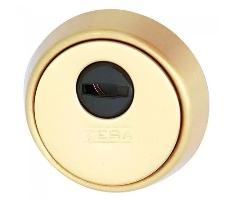 Захисний протектор для циліндра Tesa Е700 латунь Броненакладка Tesa E700 призначена для встановлення на двері для захисту циліндра замка. Складається із 6 пластин сталі та обладнана латунною антизламною вставкою. Вона підсилює безпеку, запобігаючи спробам вибивання або висвердлювання циліндрового механізму. Діаметр: 63 мм. Висота H: 21 мм. Компанія TESA — іспанський лідер із виробництва продукції систем замикання. Маючи надзвичайно широкий асортимент, ця компанія випускає замкові циліндри, системи антипаніки, контролери доступу, електричні замки та засувки, електромагнітні засувки, дверні довідники та навіть бронедвері. Продукція компанії TESA широко відома та використовується у всьому світі: в Європі та країнах Азії, в Африці та Америці.