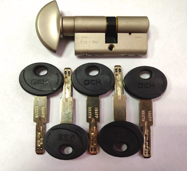 Циліндр AGB Scudo DCK 30×40 ключ/тумблер (Італія) Замковий циліндр AGB Scudo DCK ключ/тумблер матовий хром (Італія). Абревіатура DCK (Duplicate Controlled Key) розшифровується як – контроль від копіювання ключа. Циліндр має двосторонній ключ. Нарізка ключів здійснюється тільки компанією виробником і тільки з секретної кодової комбінації. У циліндрі є багаторівневий захист запобігає несанкціоновані розтин. Особливості: 15 радіальних і асиметричних пінів з високоякісної загартованої сталі і нерухомі штифти для запуску рухомих елементів ключа; 2 захисні вставки від висвердлювання із загартованої сталі з кожної сторони ключа; 5 плоских двосторонніх ключів з мельхіору з рухомими елементами і ергономічним захопленням, запатентовані компанією «AGB»; Протизломна ХР планка зі спеціальної сталі захищає циліндр від виламування; На кожній стороні встановлено три оберігають від висвердлювання вставки із загартованої сталі; Комплектація: циліндр ключі (5 штук) персональна кодова картка інструкція для монтажу, кріпильний гвинт.