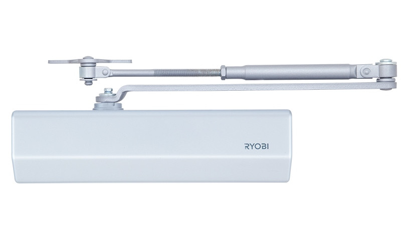 Дотягувач дверний накладний RYOBI D-2550 BC UNIV до 80кг сріблястий D-2550 BC UNIV – дотягувач накладного типу для внутрішніх та зовнішніх дверей класу 1-4. Технічні характеристики Клас 1-4. BC – гальмо відчинення. Максимальна вага дверей – до 80 кг. Максимальна ширина дверей – 1100 мм. Регулювання початкової та кінцевої швидкостей зачинення. Ресурс експлуатації – 1 000 000 циклів. Робоча температура – від – 20°С до + 45°С. Розміри – 250х67х53 мм. Можливість застосування у протипожежних дверях з межею вогнестійкості 60 хвилин. Сертифікований згідно EN 1154. Комплектація Комплект кріплення, тяга універсальна (стандартна, кронштейн паралельної тяги), пластикова декоративна кришка. Компанія Ryobi Limited була створена в 1943 році як виробник високоякісного лиття для японської промисловості. Надалі Ryobi Limited розширила своє виробництво на сьогоднішній день є компанією світового класу, що виробляє друкарське обладнання, інструменти, будівельні вироби та ін Дверні дотягувачі японського виробника RYOBI є взірцем високої якості, надійності та стильного дизайну.