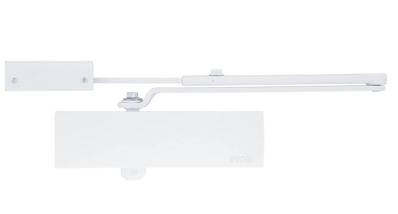 Дотягувач дверний накладний RYOBI D-1200P(U) BC UNIV до 80кг білий D-1200P(U) BC UNIV – дотягувач накладного типу для внутрішніх та зовнішніх дверей класу 2/3/4. Регулювання класу дотягувача здійснюється шляхом переміщення його по дверному полотну. Технічні характеристики Клас 2/3/4. BC – гальмо відчинення. Максимальна вага дверей – до 80 кг. Максимальна ширина дверей – 1100 мм. Регулювання початкової та кінцевої швидкостей зачинення. Ресурс експлуатації – 500 000 циклів. Робоча температура – від – 20°С до + 45°С. Розміри – 182.5х50х39 мм. Сертифікований згідно EN 1154. При монтажі дотягувача з кронштейном для паралельного положення тяги щодо дверей, максимальна вага дверей повинен становити 60 кг, а ширина 950 мм Комплектація Комплект кріплення, тяга універсальна (стандартна, кронштейн паралельної тяги), декоративна кришка. Компанія Ryobi Limited була створена в 1943 році як виробник високоякісного лиття для японської промисловості. Надалі Ryobi Limited розширила своє виробництво на сьогоднішній день є компанією світового класу, що виробляє друкарське обладнання, інструменти, будівельні вироби та ін Дверні дотягувачі японського виробника RYOBI є взірцем високої якості, надійності та стильного дизайну.