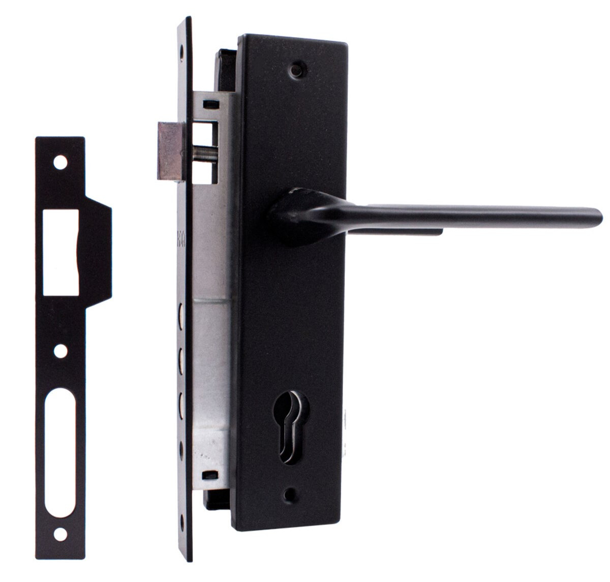 Комплект для міжкімнатних дверей RDA Blade PZ (механізм 745-3RB) чорний RDA Blade PZ — комплект дверної фурнітури з механізмом 745-3RB під циліндр, призначений для встановлення на міжкімнатні двері. До складу входить ручка на планці та врізний замок. Елементи виготовлені з міцної сталі, що забезпечує високу надійність і тривалий термін експлуатації. Комплект універсальний — підходить для дверей із різних матеріалів і може застосовуватися як у житлових, так і в громадських приміщеннях. ТЕХНІЧНІ ХАРАКТЕРИСТИКИ Тип встановлення: ручка на планці Матеріал: сталь Міжосьова відстань: 85 мм Backset: 45 мм RDA — виробник якісної дверної фурнітури, продукція якого відповідає українським ГОСТам і європейським стандартам, забезпечуючи надійність, зручність і сучасний зовнішній вигляд. П64513