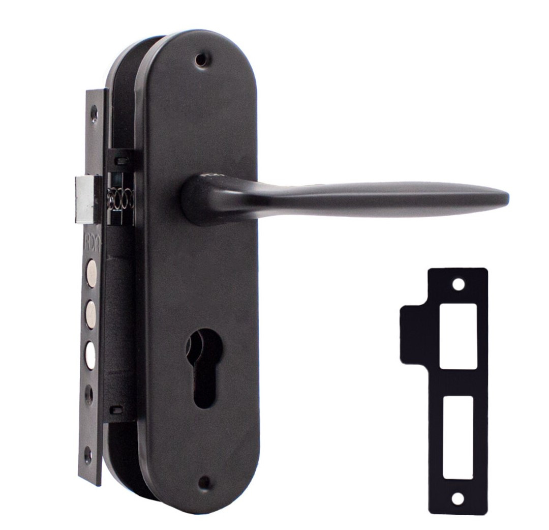 Комплект для міжкімнатних дверей RDA Time PZ (механізм 1025) чорний RDA Time PZ – комплект фурнітури з механізмом 1025 призначений для встановлення на міжкімнатні двері. До комплекту входить ручка на планці та врізний замок. Виріб виготовлений із високоякісної сталі, що гарантує надійність і довговічність в експлуатації. Комплект підходить для дверей із різних матеріалів і може використовуватися як у житлових, так і в комерційних приміщеннях. ТЕХНІЧНІ ХАРАКТЕРИСТИКИ Тип встановлення: ручка на планці Матеріал: сталь Міжосьова відстань: 62 мм Backset: 40 мм RDA — виробник якісної дверної фурнітури, продукція якого відповідає українським ГОСТам і європейським стандартам, забезпечуючи надійність, зручність і сучасний зовнішній вигляд. П64501