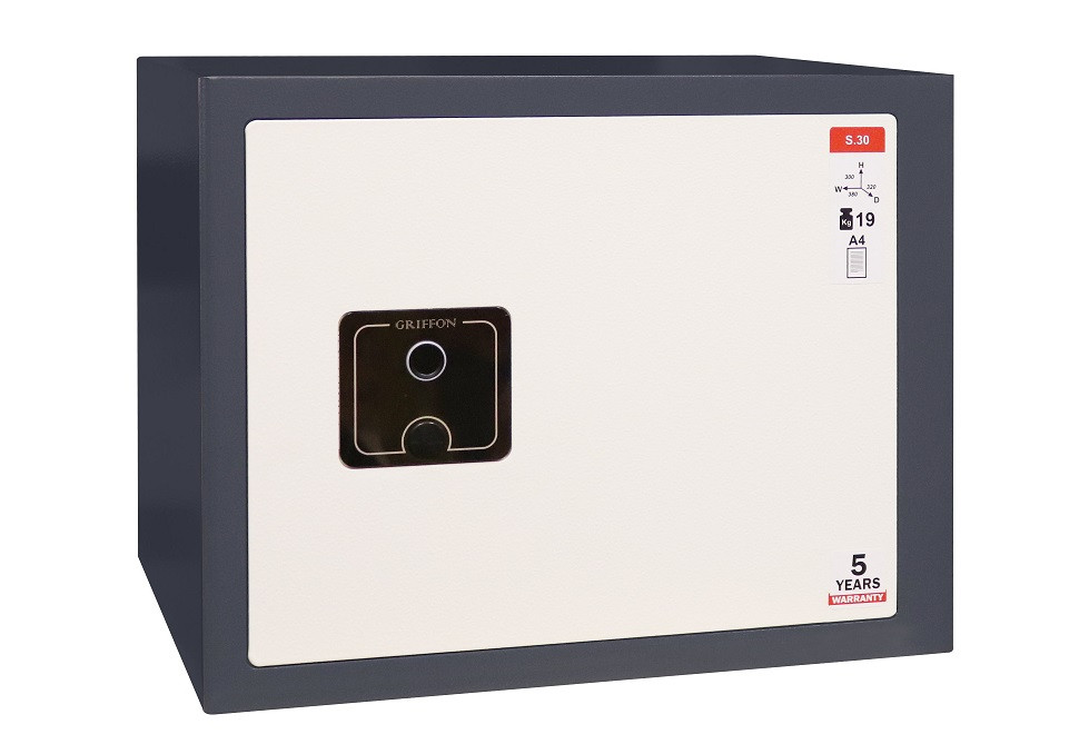 Сейф меблевий GRIFFON S.30 Fingerprint GRIFFON S.30 Fingerprint — сертифікований компактний сейф із біометричним замком, призначений для зберігання та захисту грошей, ювелірних прикрас, цінних паперів, документів від несанкціонованого доступу. Простий у програмуванні та користуванні, керується відбитком пальця. Можливість додати до 32 відбитків пальців. Наявність аварійного ключового замка, за допомогою якого сейф можна відкрити ключем без відбитка пальця. Товщина металу корпусу — 3 мм. Товщина металу дверей — 3 мм. Система замикання ригельна система (2 хромованих активних обертових ригелі, діаметр ригеля 25 мм). Анкерні вузли для кріплення сейфа до підлоги та стіни. Колір сейфа — антрацитово-сірий, кремово-білий (RAL 7016, RAL 9001). Зовнішні розміри (висота х ширина х глибина) – 300 x 380 x 320 мм. Внутрішні розміри (висота х ширина х глибина) — 294 x 374 x 265 мм. Вага – 20 кг. Об’єм, л – 29. Кількість полиць – 1 шт. Тип замка – биометрический замок GRIFFON.FP.LIGHT. Тип покриття — порошкове. Гарантия на сейф — 5 років. Гарантія на замок — 1 рік. Виробник – Паритет-К, Україна. Компанія «Паритет-К» — лідер ринку України з виробництва та продажу сейфів і засобів для безпечного зберігання цінностей. З 1992 року компанія виробляє продукцію високої якості для потреб європейського та українського споживача. Якість продукції відповідає високим міжнародним стандартам ISO 9001 Компанія «Парітет-К» — єдиний в Україні серед виробників сейфів і засобів для безпечного зберігання член Асоціації Європейських систем безпеки ESSA. Виробництво та постачання єдиної продукції для ринку Європи й України Продукція проходить сертифікаційні випробування в Європі. Сертифікація продукції відбувається згідно з європейськими стандартами EN 1143-1, EN 14450, EN 15659 У виробництві застосовуються передові технічні та конструкторські рішення власним конструкторським бюро «Парітет-К» має унікальні запатентовані розробки у виробництві сейфів і заввишки банківських сховищ