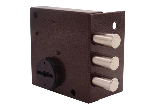 Сувальдний накладний замок Шерлок 04.51-S-3 без планки 3 ключі Шерлок 04.51-S-3 – накладний дверний замок сувальдного типу секретності для дерев’яних і металевих дверей. Три сталевих загартованих ригелі діаметром 12 мм надійно оберігають від злому. Оптимально підходить для монтажу на складські або гаражні двері. ТЕХНІЧНІ ХАРАКТЕРИСТИКИ: Кількість ригелів – 3. Діаметр ригелю – 12 мм. Кількість ключів – 3 шт. Backset – 53.5 мм. Матеріал замку – сталь. Тип замку – накладний. КОМПЛЕКТАЦІЯ: Замок. Комплект ключів 3 шт. Упаковка. Виробник дверної фурнітури Шерлок – команда професіоналів у замковому бізнесі, працює на ринку замкової продукції з 1994 року. Вся продукція сертифікована, із заводською гарантією. Компанія докладає великих зусиль для виробництва якісних продуктів, які тестує у своїй власній лабораторії та покращує якість та рівень захисту. Основний принцип роботи компанії – це якісний продукт за найкращою ціною. Зробивши вибір на користь дверних циліндрів Шерлок, клієнт гарантовано отримує якісний товар з довгим терміном експлуатації.