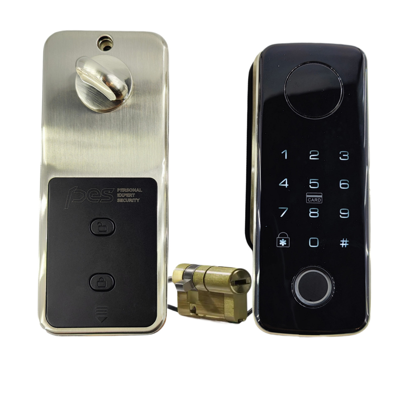 Замок редуктор PES David для керування євроциліндром PES David — універсальний електронний замок-редуктор на вхідні двері із зовнішнім біометричним зчитувачем. За допомогою такого замка можна використовувати раніше встановлений замок для дистанційного керування прямим ригелем. Встановлюється як накладний привод на стандартний євроциліндр з довгим штоком и кріпиться через штатні отвори для зовнішньої броненакладки. Можна використовувати для будь-якого типу дверей з будь-яким типом відкривання. Відкриття замка можливе такими способами: Смартфоном, за допомогою безплатного застосунку Smarta Lock. Відбитком пальця. За допомогою введення пароля на сенсорній клавіатурі. або . За допомогою механічного ключа. RFID-карта. ТЕХНІЧНІ ХАРАКТЕРИСТИКИ Замок із моторизованим циліндровим механізмом. Тип встановлення — накладний. Універсальність — підходить для встановлення на лівосторонні і на правосторонні двері. Безплатний мобільний застосунок Smarta Lock дає змогу додати й одночасно використовувати будь-яку кількість замків. Можна відкривати з будь-якої точки світу (опціонально за допомогою шлюзу ). Всі елементи конструкції й електроніка замка мають захист від вологи та пилу стандарту IP55. Керування електронним накладним замком здійснюється: Відбитком пальця (200 шт.); ПІН-кодом (150 шт.); Картками/ (200 шт.); Механічним ключем (2 шт.); Bluetooth (через безкоштовний мобільний застосунок); Wi-Fi (опціонально за допомогою шлюзу ); За допомогою ; Інтеграція з Ajax; Під час інтеграції з розумним будинком GOOGLE HOME/AMAZON ALEXA можна керувати замками за допомогою голосу або смарт сценаріїв. Окремо можна придбати . Рекомендується додатково придбати шлюз . Він дасть змогу, маючи доступ в інтернет, відкривати замок за допомогою телефона, видаляти/змінювати наявні паролі, подивитися хто, яким способом і в який час відкривати замок, отримувати PUSH повідомлення відразу ж після відкриття замка із зазначенням часу та імені, контролювати та запитувати стан замка (відкритий він або закритий), бачити рівень заряду батарейок із будь-якої точки світу. МОЖЛИВОСТІ ЗАМКА PES David Можливість відкривати/закривати замок за допомогою телефона через bluetooth, видаляти наявні паролі, подивитися хто, яким способом і в який час відкривав замок і бачити рівень заряду, перебуваючи поруч із замком. Мобільний застосунок дає змогу відстежити статус замка, закритий він чи ні, а також є можливість побачити час, у який він був закритий/відкритий. Для роботи замка не потрібно тягнути дроти для під’єднання живлення. Можливість аварійного відкривання у разі розряджання. У замках передбачена можливість під’єднання резервного або екстреного живлення. Подати живлення можна через роз’єм Micro USB, який розташований на зовнішній частині замка. Це можна зробити або через звичайний блок живлення мобільного телефона або від зовнішнього акумулятора (типу Power Bank). Базова комплектація: Накладний електропривод. Зовнішній зчитувач. Циліндровий механізм зі штоком ( стандартний). Комплект установлювальний. Інструкція щодо встановлення та програмування. Брелок — 2 шт. Ключі — 2 шт. Для безперебійної роботи PES David використовуйте комплект зарядного пристрою та батарейок. Замовити можна за . Smarta Lock За допомогою програми Smarta Lock ви можете легко керувати та налаштовувати дверні замки PES з будь-якого місця. Ви можете надавати користувачам дос