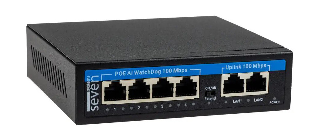 PoE світч для систем відеоспостереження SEVEN P-7324 на 4 порти SEVEN P-7324 – мережевий комутатор для під’єднання до систем відеоспостереження. Працює з девайсами стандарту IEEE 802.3 af/at. Можливе під’єднання до 4 пристроїв для одночасної роботи. Функція автоматичного перезавантаження РoЕ watchdog під час зависання системи. Встановлення суто всередині приміщень. ТЕХНІЧНІ ХАРАКТЕРИСТИКИ: PoЕ WatchDog AI комутатор стандарту IEEE 802.3af/at. 4 PoE порти 100 Мбіт/c + 2 Uplink порту 100 Мбіт/c. Вихідна потужність 15W на PoE порт (максимально 30W) Загальний PoE бюджет світча — 60W. WatchDog на всіх PoE портах Режим Extend — подовження лінії, передавання сигналу та живлення до 250 м Функції: алгоритм запобігання втраті пакетів, захист від перенапруг до 6KV, вбудований захист від перешкод, грозозахист. Робочі умови: температура 0°… +60°, вологість 0… 95%. Живлення: вбудований блок живлення 220V. Габаритні розміри: 130 x 120 x 35 мм. Компанія SEVEN Systems упродовж 5 років займає лідерські позиції на ринку обладнання за системами контролю доступу, а зокрема за автономними рішеннями. Щорічно є учасниками в профільових виставках, як-от Expert Security та IntrererBuildExpo.