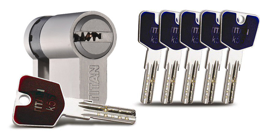 Titan K55 ключ/половинка TITAN K55 – повний аналог циліндра К5, відзнакою К55 від К5 є наявність системи монтажного ключа. Дана система комплектується одним монтажним і п’ятьма основними ключами. В основу даної системи покладено принцип автоматичного програмування ключів. Спочатку циліндр запрограмований на роботу з монтажним ключем. Як тільки використаний один з основних ключів, циліндр перепрограмується і починає працювати тільки з основними ключами, при цьому подальше використання монтажного ключа неможливо. Циліндр К55 буде зручним у тих випадках, коли до вхідних дверей якийсь час мають доступ сторонні люди, наприклад, будівельники під час ремонтних робіт. Після закінчення ремонту власник приміщення без будь-яких додаткових витрат і зусиль змінює програму ключа, після чого ключ, яким користувалися будівельники, перестає відкривати двері. Защита від відкриття відмичками – спеціальні піни особливої форми. Захист від розтину методом бампінгу – спеціальні анти-бампінг піни. Захист від висвердлювання корпусу – стрижні із загартованої сталі особливої форми. Можливість створення майстер-систем. Кількість пінів – 10. Висока точність виготовлення. Профільний циліндр з перфорованим ключем. Матеріал виготовлення ключів – нікельована сталь. Подовжена шийка ключа. Кількість ключів в комплекті – 5 основних, 1 монтажний. Виробництво – Словенія. ВАРІАНТИ ВИКОНАННЯ ЦИЛІНДРА TITAN K5 Циліндр Titan K5 доступний в наступних варіантах виконання – , ключ/ключ, ключ/половинка, . Компанія TITAN, заснована в 1896 році в Словенії, є провідною європейською компанією в виробництві скобяної продукції: замків і циліндрів для вхідних дверей, майстер-систем, замків для дерев’яних дверей, дверей з ПВХ, алюмінієвого профілю, фурнітури для меблевої промисловості і ін. Виробництво і складання продукції TITAN розташовані в Словенії, в місті Камнік і здійснюється на сучасному обладнанні з використанням комп’ютерних технологій. Компанія TITAN входить в міжнародну групу SECURIDEV – світового лідера в області систем замикання і супутнього обладнання.