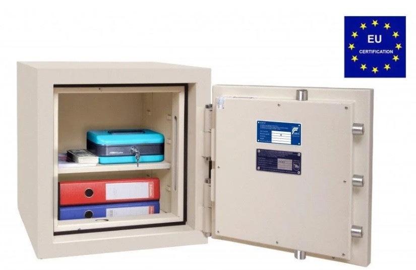 Вогнезламостійкий сейф GRIFFON CLE.II.50.КС Сертифікований вогнезламостійкий сейф GRIFFON CLE II.50.КС призначений для зберігання і захисту грошей, ювелірних прикрас, цінних паперів, документів, цінностей, особистого вогнепальної і холодної збр-ї від пожежі та несанкціонованого доступу (злому). Габаритна глибина сейфа з урахуванням ручки – 520 мм Висока ступінь безпеки – Grade II в системі ECB-S (Німеччина). Двері сейфа обладнані потужною системою ригеля замикання чотиристоронньої дії. Надійний ригельний механізм, блокуючий двері, оснащений хромованими активними ригелями діаметром 25 мм, що діють у вертикальному та горизонтальному напрямках. Обладнаний нерухомими ригелями, що виключають можливість відкривання дверей сейфа при зрізаних петлях. Конструкція ригеля системи виключає відчинення сейфа шляхом силової дії на ручку. В цілях збільшення надійності сейфа проти зламу, місця кріплення замків захищені потужними розжареними пластинами з легованої стали. Одна полиця (дві зони зберігання). Гарантія на сейф на 5 років, на замок 1 рік. Зовнішні петлі, що дозволяють відкривати двері на 180°, не перекриваючи дверний проріз. Передбачено два варіанти кріплення сейфа до підлоги: або безпосередньо з допомогою анкерних болтів до підлоги (через два монтажні отвори), або за допомоги спеціального кронштейна (8 монтажних отворів). Монтажний комплект для кріплення сейфа за допомоги кронштейна замовляється окремо. Обладнаний ключовим замком STUV і електронним кодовим замком M-LOCKS (Нідерланди) класу VDS 2 Сейф сертифікований у відповідності зі стандартами EN 1143-1 і EN 15659 (Сертифікат додається) Зовнішні розміри (ВхШхГ), мм: 506x460x480 Внутрішні розміри (ВхШхГ), мм: 390x350x312 Вага, кг: 210 Кількість полиць: 1 шт, знімна Тип замку: Сертифікований ключовий замок STUV і механічний кодовий замок M-LOCKS (Нідерланди) класу VDS 2 Тип покриття: Емаль Гарантія: 5 років Виробник, країна: Паритет-К (Україна) Компанія «Паритет-К» – лідер ринку України з виробництва та продажу сейфів та засобів для безпечного зберігання цінностей. З 1992 року компанія виробляє продукцію найвищої якості для потреб європейського та українського споживача. Якість продукції відповідає високим міжнародним стандартам ISO 9001. Компанія «Паритет-К» – єдиний в Україні серед виробників сейфів та засобів для безпечного зберігання член Асоціації Європейських Систем Безпеки ESSA. Виробництво та постачання єдиної продукції для ринку Європи та України. Продукція проходитиме сертифікаційні випробування в Європі. Сертифікація продукції відбувається згідно з європейськими стандартами EN 1143-1, EN 14450, EN 15659. У виробництві застосовуються передові технічні та конструкторські рішення власним конструкторським бюро. «Паритет-К» має унікальні запатентовані розробки у виробництві сейфів та спорудження сховищ.