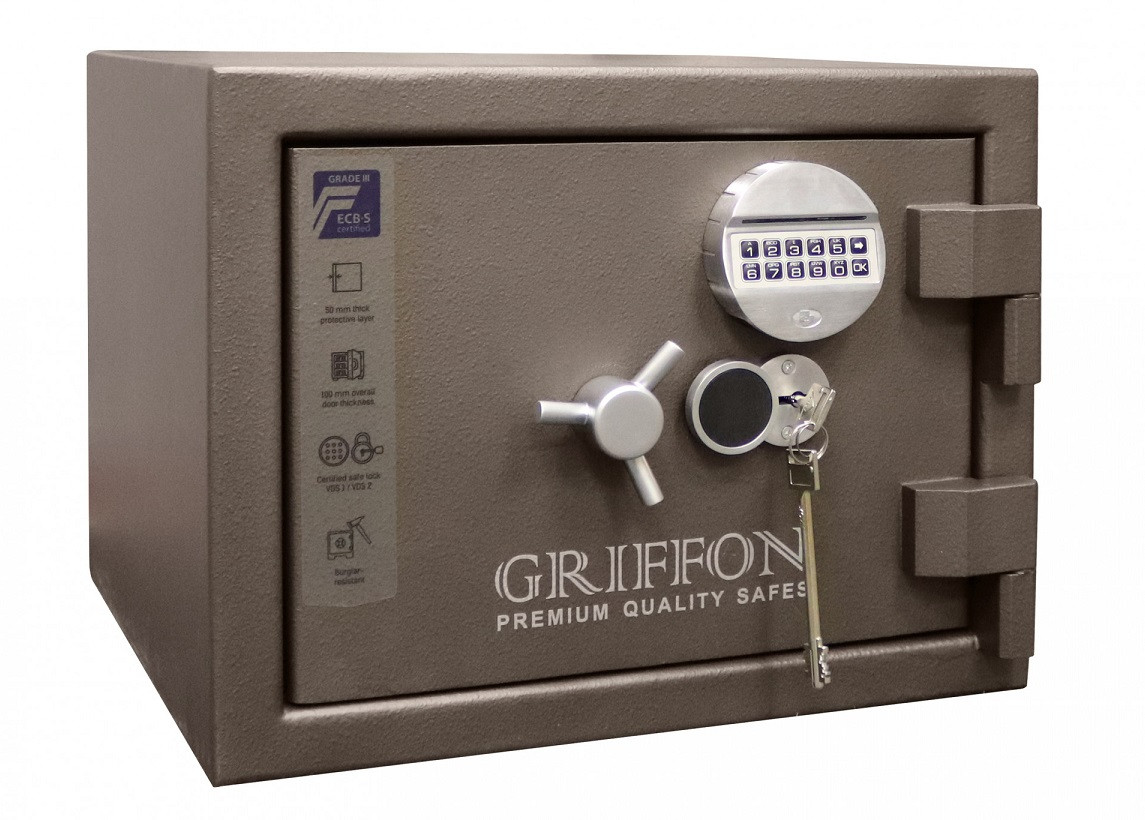 Сейф вогнезламостійкий GRIFFON CLE III.37.K.E GRIFFON CLE III.37.K.E — сертифікований сейф для зберігання та захисту грошей, ювелірних прикрас, цінних паперів, документів від зламу та дії вогню. Обладнаний сталевими легованими пластинами для захисту від висвердлювання та вибивання замків і ригелів. Стінки корпусу мають захисний шар із фортифікаційного бетону завтовшки 580 мм. Сертифікований у Німеччині Європейським органом сертифікації ECB-S по III класу опору до зламу EN 1143-1. Захисний шар корпусу — фортифікаційний бетон завтовшки 50 мм. Клас вогнестійкості LFS 30P за ДСТУ EN 15659. Система замикання ригельна система тристоронньої дії (8 хромованих активних обертових ригелів, діаметр ригеля 25 мм) й антизрізи з боку петель. Анкерні вузли для кріплення сейфа до підлоги та стіни, термострічка. Колір сейфа — коричневий. Зовнішні розміри (висота х ширина х глибина) — 370 x 480 x 450 мм. Внутрішні розміри (висота х ширина х глибина) – 270 x 380 x 290 мм. Вага – 160 кг. Об’єм, л – 29. Кількість полиць – 1 шт. Тип замка – ключовий сейфовий замок STUV (Німеччина), сертифікат класу VDS 2, електронний кодовий замок TECHOCICUREZZA (Італія). Тип покриття — порошкове покриття. Гарантия на сейф — 5 років. Гарантія на замок — 1 рік. Виробник – Паритет-К, Україна. Компанія «Паритет-К» — лідер ринку України з виробництва та продажу сейфів і засобів для безпечного зберігання цінностей. З 1992 року компанія виробляє продукцію високої якості для потреб європейського та українського споживача. Якість продукції відповідає високим міжнародним стандартам ISO 9001 Компанія «Паритет-К» — єдиний в Україні серед виробників сейфів і засобів для безпечного зберігання член Асоціації Європейських систем безпеки ESSA. Виробництво та постачання єдиної продукції для ринку Європи й України Продукція проходить сертифікаційні випробування в Європі. Сертифікація продукції відбувається згідно з європейськими стандартами EN 1143-1, EN 14450, EN 15659 У виробництві застосовуються передові технічні та конструкторські рішення власним конструкторським бюро «Парітет-К» має унікальні запатентовані розробки у виробництві сейфів і заввишки банківських сховищ