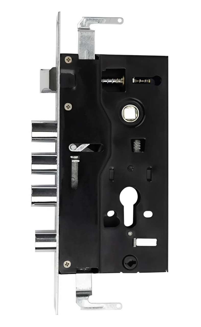 Корпус врізного основного замка CLASS А14 L, BS60мм 68 мм, круглий ригель Врізний циліндровий замок CLASS A14L використовується як основний (нижній) для вхідних металевих дверей, у тому числі «китайських». Конструкція передбачає кріплення для тяг (за потреби їх можна зняти). Замок оснащений чотирма круглими ригелями: три керуються серцевиною за два оберти, додатковий — воротком. Максимальний вихід ригелів — 20 мм. Дана модифікація є лівосторонньою і встановлюється на двері з лівим відчиненням. Корпус замка виконаний із міцної сталі, торцева планка має покриття CP (хром). ТЕХНІЧНІ ХАРАКТЕРИСТИКИ Тип встановлення: нижній основний Призначення: вхідні металеві двері Спосіб монтажу: врізний Орієнтація: лівосторонній Механізм зачинення: серцевина + ручка Язичок: сталевий, з гальванічним покриттям Кількість ригелів: 4 круглі сталеві ригелі (3 — від серцевини, 1 —