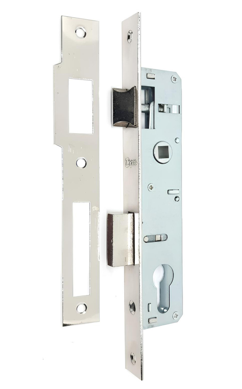 Врізний основний вузькопрофільний замок CLASS 153-20 (без циліндра) нікель Корпус замка CLASS 153-20 належить до серії вузькопрофільних врізних циліндрових замків і застосовується для встановлення в алюмінієві та металеві двері з вузьким профілем, а також у профільні хвіртки. Завдяки компактним розмірам і глибині посадки (Backset 20 мм), замок можна встановлювати в вузькі дверні профілі без додаткового доопрацювання. Корпус замка виготовлений з оцинкованої сталі, стійкої до корозії та механічних пошкоджень. Ригель і засувка виконані з хромованого цинкового сплаву, що підвищує зносостійкість і надійність механізму навіть при частому використанні. Механізм універсальний — може встановлюватися як у лівосторонні, так і у правосторонні двері. Конструкція розрахована на використання з циліндрами стандарту EURO DIN, що забезпечує сумісність з найпоширенішими типами серцевин. Замок відповідає 2-му класу безпеки і призначений для дверей з невеликим та середнім навантаженням (офісні приміщення, хвіртки приватних будинків, господарські споруди). ТЕХНІЧНІ ХАРАКТЕРИСТИКИ: Тип: корпус замка, врізний, циліндровий Модель: CLASS 153-20 Призначення: вузькопрофільні двері з алюмінію, металу та профільні хвіртки Матеріал корпусу: оцинкована сталь Матеріал ригеля та засувки: хромований цинковий сплав Міжосьова відстань: 85 мм Backset (відступ): 20 мм Клас безпеки: 2-й Сумісність: циліндри EURO DIN Напрямок відчинення дверей: універсальне (ліве / праве) CLASS — це надійний китайський виробник замків і фурнітури для побутового та господарського використання. В асортименті бренду — навісні, врізні та накладні замки, механізми різної форми та ступеня захисту. Продукція CLASS виготовляється з міцних матеріалів (чавун, сталь, латунь) та орієнтована на практичне застосування: склади, ворота, комори, шафи й приміщення загального користування. Замки відрізняються простою конструкцією, стабільною якістю та доступною ціною. Бренд представлений на ринку понад 10 років і активно використовується в країнах Східної Європи та Азії.