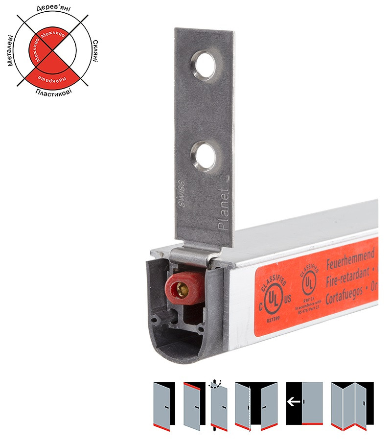 Автоматичний висувний поріг PLANET RS 710 мм PLANET RS — поріг висувний для профільних ПВХ дверей, розташованих у приміщеннях із рівною поверхнею підлоги. Тихе, рівномірне паралельне опускання з автоматичною компенсацією нахилу підлоги. Перешкоджає проникненню звуку, світла, протягу, сприяє енергоощадності та дотриманню конфіденційності. Є димозахисним і протипожежним. ТЕХНІЧНІ ХАРАКТЕРИСТИКИ Модель порога RS. Сторонність — універсальна. Ширина дверного полотна — від 585 до 710 мм. Розмір порога: 20*20,8 мм. Акустична ізоляція — до 50 дБ. Довжина ущільнювача 710 мм. Глибина опускання — до 16 мм. Зменшення довжини в межах 115 мм. Кріплення входить до комплекту. Пороги серії RS розроблені спеціально для використання в профільних дверях ПВХ. Кріплення 16 мм розраховане під фурнітурний паз у ПВХ профіль. Глибина опускання — до 16 мм. Можливе використання порог серії RS на двостулкових дверях разом із врізними торцевими та центральними шпінгалетами з круглими та прямокутними ригелями різних виробників. Пін — активатор (жовтогарячого кольору) опускання ущільнювача спеціальної скошеної форми. Завдяки цьому спрацьовування ущільнювача відбувається в момент зачинення дверей, на 5-10°, ущільнювач менше зношується. Можливе замовлення порогів серії зі спеціальним кріпленням для певних торгових марок профілів. Для монтажу на розсувні двері замовляти з опцією: для розсувних дверей 900908. Для використання на нерівних підлогах замовляти з опцією: ущільнювач для нерівних підлог 900895 (умовляти сторонність дверей). Компанія Planet GDZ AG заснована у Швейцарії 1945 року. Все почалося в столярній майстерні В. Яги та сини (W. Jaggi und Söhne) у Цюрію (Швейцарія). Упродовж усієї своєї історії Planet виготовляє автоматичні ущільнювачі та пороги для герметизації дверей. Компанія широко відома своїми інноваційними розробками. Переваги герметичних дверей оцінили вже понад мільйон68. Автоматичні ущільнювачі та пороги Planet призначені для герметизації дверей. Використання цих комплектуючих виробів у конструкції дверцят різко знижує рівень зовнішнього шуму (до 50dB), спеціальні моделі ущільнювачів здатні забезпечити вогнетривк- та димозахист приміщень. PLN-59071