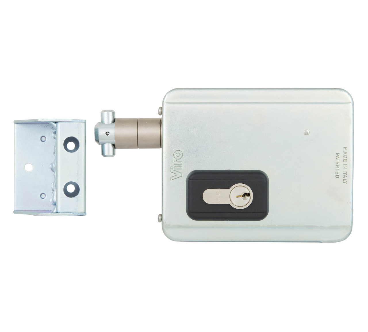 Замок електромеханічний накладний VIRO V09 VIRO V09 – електромеханічний високобезпечний накладний замок гаражного типу горизонтального встановлення з шипоподібним гарпунним механізмом замикання, що повертається в момент закриття замка. Призначений для забезпечення розмежування контролю доступу та вандалостійкого блокування вуличних автоматизованих відкатних і механічних розсувних воріт типових об’єктів – промислових, продуктових і овочевих складів, баз, автопарковок, автостоянок, інших об’єктів, на території яких забезпечується зберігання привабливих для зловмисників торговельно-матеріальних цінностей або розташування автопарку транспортних наземних засобів. BackSet: 50 мм. Замок універсальний – один варіант виконання для лівосторонніх і для правосторонніх воріт. Спосіб установки – горизонтально на стаціонарно закріплений тримач на рамі воріт. Перехід в неактивний стан замку управляється електронним таймером, розташованим в корпусі замку. Італійська компанія Viro була заснована в 1942 році під назвою Vi.Ro. – абревіатура імені та прізвища її засновника Vincenzo Rossetti. З самого початку виробництва продукція Viro відома у світі як синонім високої якості і надійності.
