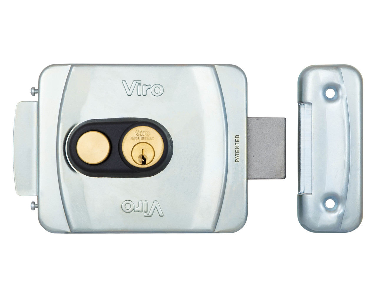 VIRO V9083.0793.P накладний, з кнопкою VIRO V9083 – електромеханічний накладний замок гаражного типу з посиленою конструкцією рухомого косого ригеля з легованої нержавіючої сталі, низькою напругою живлення змінного струму і подвійним режимом роботи. Призначений для промислових зовнішніх суцільних металевих гаражних дверей, розпашних механічних та автоматичних гаражних воріт, вуличних хвірток зі стандартною або широкою рамою. Замок універсальний – правий, лівий. Підходить для дверей, воріт, хвірток, які відкриваються усередину. Тип установки замку можливий, як горизонтальний, так і вертикальний. BackSet 50/80 мм – стандартна комплектація 60 мм, що регулюється механічно крок за кроком по осі циліндра в інтервалі 50-60-70-80 мм за допомогою ключа, який входить в комплект замку, в замках інших виробників така функція відсутня. Замок зламостійкий – витримує навантаження на міцність не менше 640 кг Італійська компанія Viro була заснована в 1942 році під назвою Vi.Ro. – абревіатура імені та прізвища її засновника Vincenzo Rossetti. З самого початку виробництва продукція Viro відома у світі як синонім високої якості і надійності.