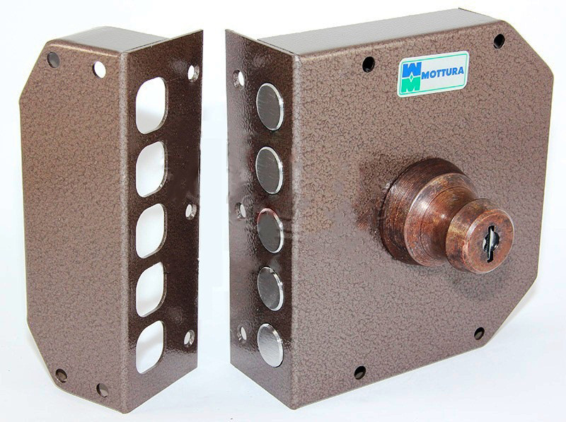 Замок накладної Mottura 30.602 D правобічний (Італія) Замок накладної Mottura 30.602 з натискним помпову циліндром і внутрішнім циліндром . Зовні замок відкривається шляхом натискання та повороту ключа в помпову циліндрі, з внутрішньої сторони поворотом ключа. Замок обладнаний п’ятьма з ригелями діаметром 18 мм і вильотом 36 мм. В даному накладному замку спеціально встановлений захисний ковпак на циліндр помпового механізму захищає від висвердлювання і перепилювання. Завдяки надійній конструкції , замок підходить на металеві та броньовані двері, складські приміщення, гаражні та іншого типу двері і ворота. Зовнішній натискний циліндр довжиною 50 мм. Гідність Мотура 30.602: компактні ключі з високим ступенем секретності, міцний корпус з можливістю кріплення в двох площинах, великі ригеля з великим вильотом, циліндр захищений від вибивання і висвердлювання і звичайно адекватна ціна за Італійський замок з багатьма достоїнствами. Комплектація: – корпус замку – 5 ключів – зовнішня декоративна накладка – відповідна планка – кріплення та комплектуючі. – паспорт Замок Mottura 30.600 випускається в правосторонньому і лівосторонньому виконання, для правобічних і двосторонніх дверей. Гарантія на замок накладної Mottura 30.602 – 24 місяця