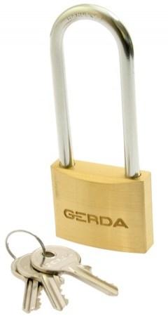 Замок навісний GERDA KMZ4030A S-40 H-66 Скоби та стержні стандартних навісних замків Gerda виготовлені з загартованої сталі. Використання монолітного корпусу з литої бронзи і високоміцних матеріалів для всіх замикаючих і кріпильних елементів значно підвищує стійкість замку, захищаючи його від спроб висвердлювання і розкриття. Використання латунного сплаву дозволяє застосовувати замок у всіх погодних умовах. В комплекті до цього замку додається три ключа.