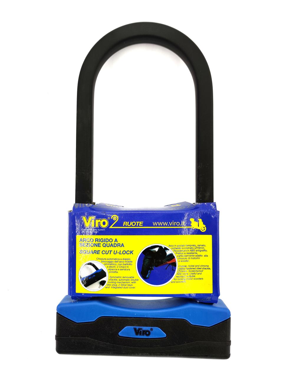Протиугінний мотозамок скоба VIRO MOTO SEZIONE BLACK 255 мм з 2 ключами Viro Moto Sezione Black 255 мм – мотозамок з корпусом з оцинкованої сталі. Двоколірний кожух (чорний і синій) стійкий до подряпин. Замок захищений ковпачком від атмосферного впливу. Циліндр із пластиною для захисту від злому. Дужка діаметром 16 мм загартована з хромованої сталі. Модель замка – SEZIONE. Колір оздоблення – BLACK. Кількість ключів – 2KEY. Висота дужки – 255 мм. Дужка – загартована з хромованої сталі, Ø 16 мм, висота дужки 255 мм, відстань між дужками 105 мм. Корпус – довжина 165 мм, висота 50 мм, товщина 30 мм. Ключі – 2 шт. Матеріал – нейзильбер, з ергономічною головою із пластику. Вага – 1400 г. Італійська компанія Viro була заснована 1942 року. Первісна назва бренду Vi.Ro. – абревіатура імені та прізвища його засновника Vincenzo Rossetti (Вінченцо Розетті). З самого початку виробництва продукція Viro Innocenti S.p.A. відома у світі як синонім високої якості та надійності. Завдяки прагненню до інновацій та постійному вдосконаленню процесу виробництва, 1996 року Міністерство освіти та науки Італії визнало компанію «Науково-дослідною лабораторією». 1998 року відбувається поділ Viro Innocenti S.p.A. на два напрямки: Viro (виробництво традиційних механічних продуктів безпеки) та ViroTronic (інноваційний напрямок виробництва, що поєднує у продуктах безпеки механіку та електроніку).