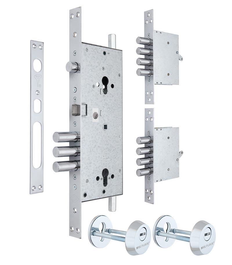 Замок врізний MUL-T-LOCK 3-WAY DIN+DIN Основний двоциліндровий замок 3-спрямованого замикання MUL-T-LOCK 415G з двома незалежними системами замикання. Патентований шестереньчастий механізм керування ригелями. Забезпечує замикання дверей у 15 точках. Може бути встановлений на двері заввишки від 1950 до 2120 мм. Технічні характеристики: Виробник — Ізраїль Бренд продукту: MUL-T-LOCK Модель замка: 415G Міжосьове — 85 мм BackSet: 63 мм Вихід основних ригелів: 41,5 мм Вихід вертикальних тяг: 28 мм Реверсивна засувка з неіржавкої сталі Вихід ригелів додаткових механізмів 31 мм Комплектація замок 2 додаткові механізми 1 комплект тяг 2 протектори циліндра Mul-T-Lock — це ізраїльська компанія, яка є одним із лідерів у світі замкових технологій. Створена 1973 року та входить до групи “ASSA ABLOY”. Mul-T-Lock впевнено йде в ногу зі світовим технічним прогресом. Висока секретність личинок замків; Максимальна точність виготовлення складових частин; Можливості сервісного обслуговування: виробництво додаткових ключів, систем 3 in 1 «Світофор» та «VIP», об’єднання циліндрів і замків у систему «Один ключ» та «Майстер-ключ», маркування ключів; Розгалужена мережа сервісних центрів. MTL7000000213