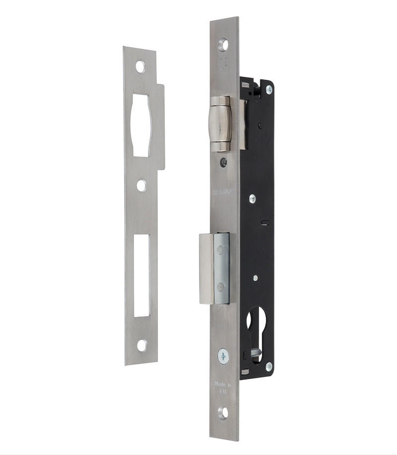 Замок врізний SANTOS DIN 720 UNIV BS25 мм SS 22 мм FOREND SP • Тип механізму замикання: DIN • Модель замку: 726 • Сторонность: UNIV • BackSet: BS25 мм • Міжосьова відстань: Без значення • Ширина торцевої планки: 22 мм Основний замок SANTOS Profile Lock 720 для профільних дверей під циліндр DIN. Сумісний з фурнітурою ROSTEX для профільних дверей. Міжцентрова відстань – 85 мм BackSet 25 мм. Глибина корпусу – 40 мм. 1 прямий ригель. Вихід ригеля – 16 мм. Реверсивна заскочка. Сторонність – універсальна (права/ ліва). Торцева планка: обробка – нержавіюча сталь, ширина – 22 мм. Комплектація: замок, зворотна планка, пластиковий щиток чорний PZ (2 шт.) Компанія SANTOS® (Португалія) почала свою роботу на ринку механічних систем замикання в 1952 році. Замки SANTOS® (Сантос) відрізняються високою якістю і відповідають технічним стандартам всіх європейських країн. Крім того, величезна кількість різних за розмірами моделей і серій охоронних механізмів SANTOS® дозволяють підібрати замок для будь-якого типу дверей.