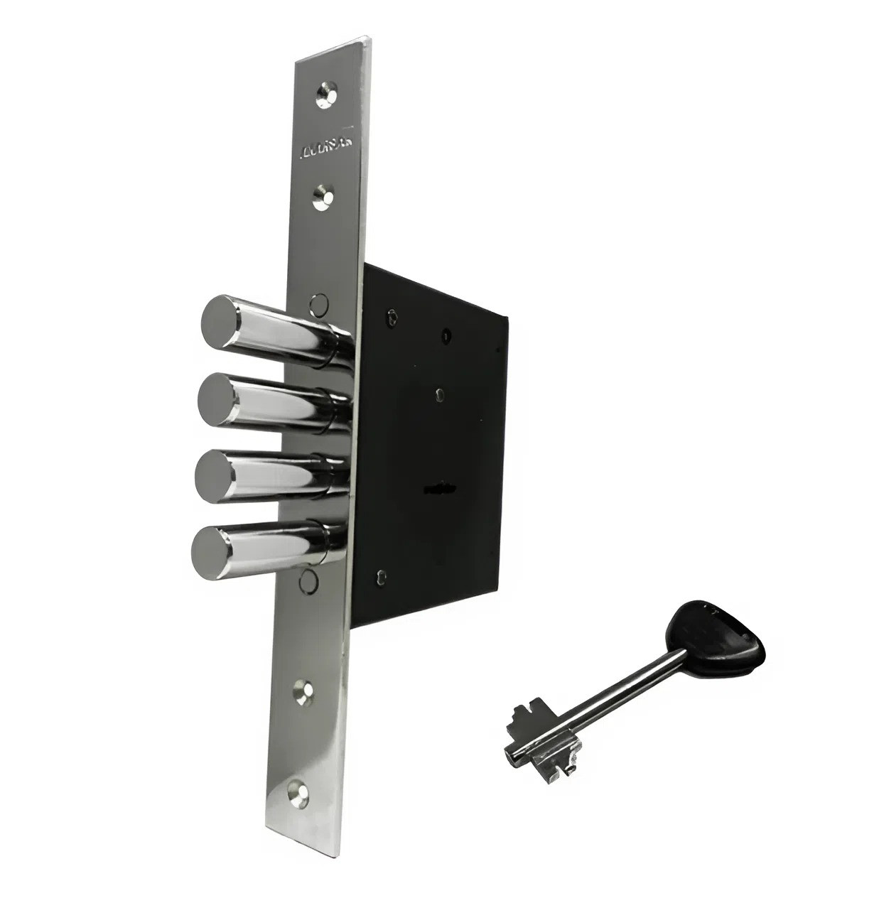 Додатковий замок для дверей Akarsan M.101, сувальдний Akarsan M.101 — врізний замок для встановлення на дерев’яні и металеві двері як додатковий засіб захисту, а також можуть використовуватися в сейфах і металевих шафах. Обладнаний потужним засуванням із чотирьох сталевих стрижнів круглого перерізу діаметром 14 мм, із загальним вильотом 40 мм за чотирьох напівобертів ключа. Ключ витягується після кожного другого напівоборту. ТЕХНІЧНІ ХАРАКТЕРИСТИКИ: Тип: врізний, сувальдного типу Габарити корпусу: 115×110×18 мм Розмір торцевої планки: 240×27×3 мм Товщина дверей для встановлення: 40–75 мм Backset: 55 мм Виліт засова: 40 мм Діаметр ригеля: 14 мм Кількість ключів: 3 шт. Akarsan — турецький бренд, заснований 1969 року, що спеціалізується на виробництві механічних і електромеханічних систем безпеки. Компанія випускає надійні врізні та накладні замки, сейфові механізми та комплектуючі для дверей, а також виготовляє металеві та пластикові деталі для суміжних галузей. Завдяки власним виробничим потужностям і сучасним технологіям Akarsan зарекомендувала себе як стабільний виробник якісних і довговічних замків, потрібних як на внутрішньому ринку Туреччини, так і за її межами.