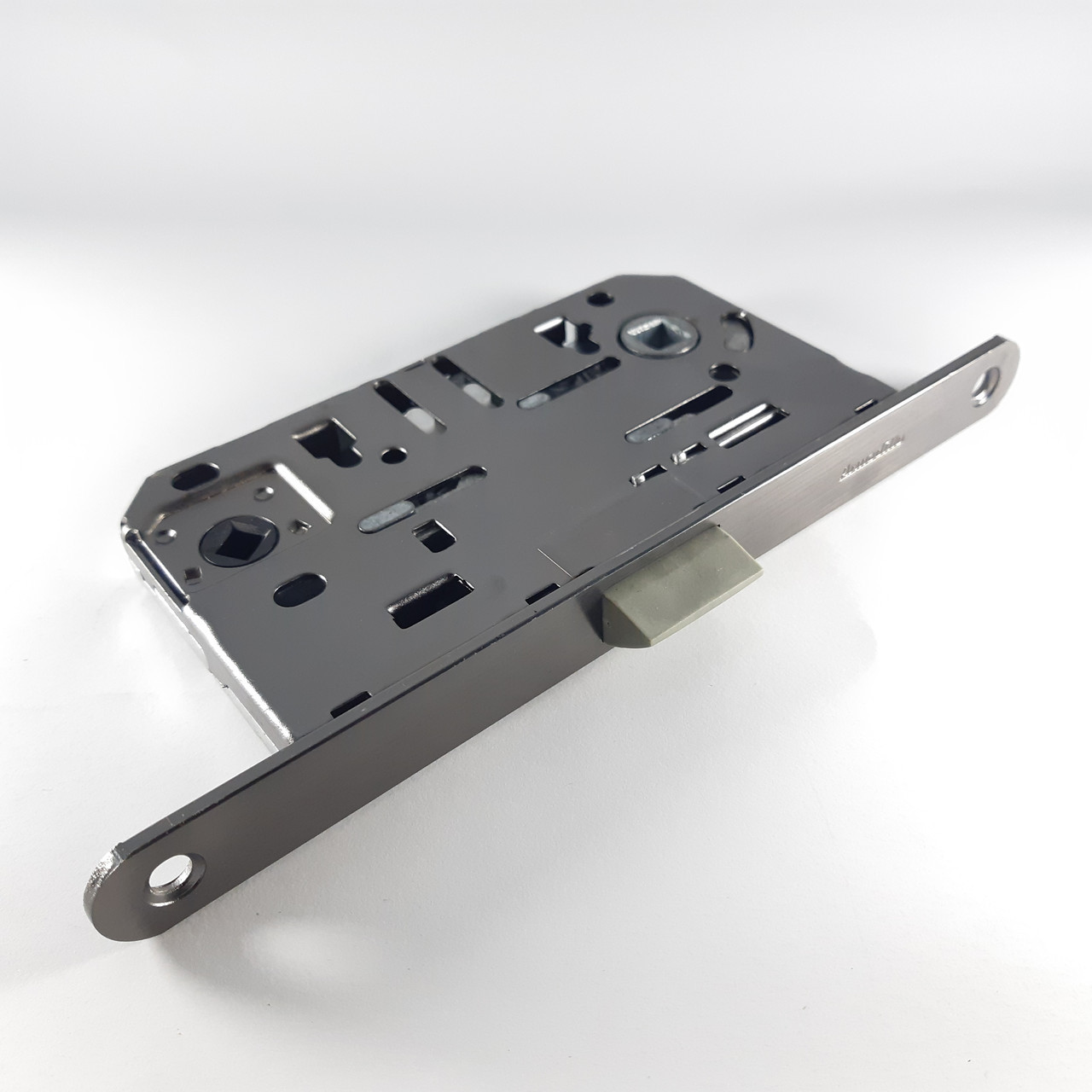 Засувка міжкімнатна Armadillo з планкою LH96-50 GR графіт Замок врізний Armadillo LH 96-50 призначений для встановлення на міжкімнатні двері з додатковим замиканням зсередини за допомогою поворотника. Корпус замка виконаний зі сталі, яка не схильна до корозії через додаткову оцинковку. Замок має додаткові отвори для встановлення ручок на стяжках. Засувка дверна Armadillo LH 96-50 має перевагу перед звичайними замками через наявність пластикової засувки (PVC), завдяки якій двері будуть закриватися дуже тихо. Даний міжкімнатний замок комплектується зворотньою планкою і саморізами. Основні характеристики: Матеріал замку: оцинкована сталь Матеріал планки: сталь з покриттям Матеріал засувки: пластик (PVC) Міжцентрова відстань: 96 мм Відстань від планки до осі ручки: 50 мм Сторона відкривання: універсальна Тип замку: під поворотник Тип механізму засувки: класичний Розмір перерізу квадрата під ручку: 8 мм Розмір перерізу квадрата під поворотник: 6 мм Товщина планки: 2 мм Тип упаковки: коробка Висота лицьової планки 196 мм; Ширина лицьової планки 18 мм; ширина корпусу 77 мм; висота корпусу 132 мм. В даний час торгова марка Armadillo вже широко відома на Українському ринку як виробник дуже якісної дверної фурнітури. Завдяки широкому модельному ряду і різноманітності кольорів в тому числі комбінованих, дозволяє зупинити свій вибір на дверних ручках компанії Armadillo навіть найвимогливіших клієнтів.