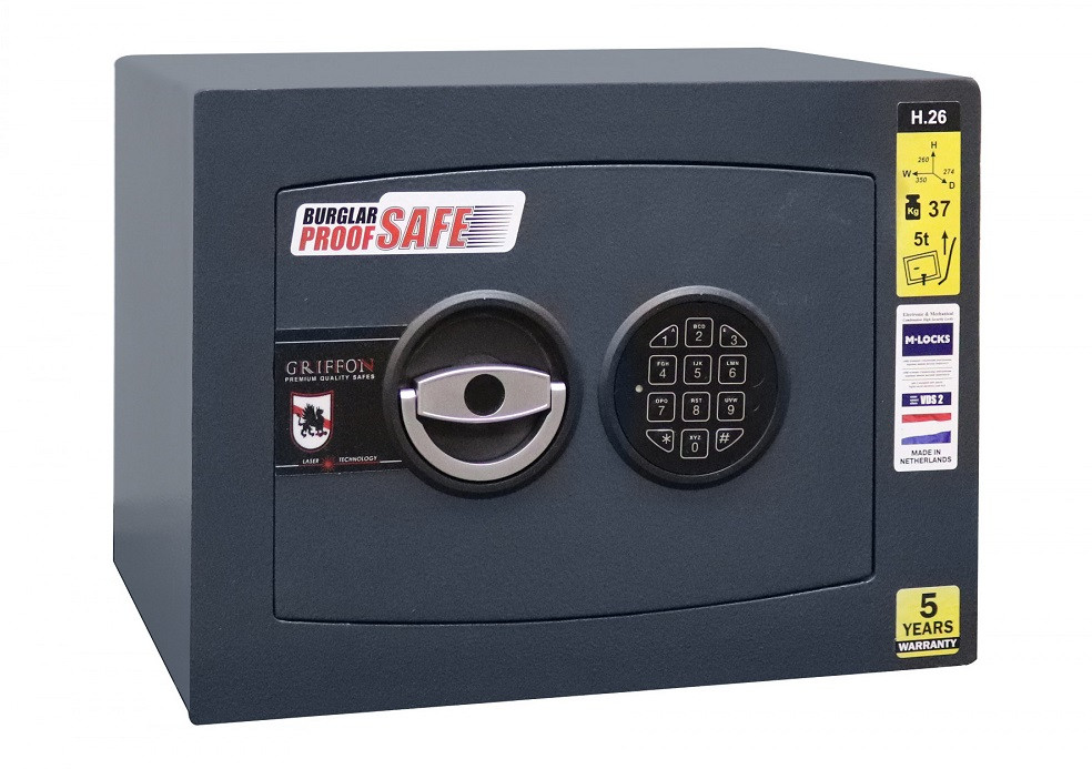 Сейф зламостійкий GRIFFON H.26.E DARK GREY GRIFFON H.26.E — сертифікований зламостійкий сейф з електронним кодовим замком, призначений для зберігання та надійного захисту грошей, ювелірних прикрас, цінних паперів, документів від несанкціонованого доступу. Сертифікований по I класу опору до злому EN 1143-1. Захисний шар корпусу — фортифікаційний бетон завтовшки 25 мм. Металеві двері завтовшки 14 мм. Система замикання ригельна система (2 хромованих активних обертових ригелі, діаметр ригеля 25 мм). Анкерні вузли для кріплення сейфа до підлоги та стіни. Колір сейфа — темно-сірий. Зовнішні розміри (висота х ширина х глибина) — 260 x 350 x 274 мм. Внутрішні розміри (висота х ширина х глибина) – 213 x 301 x 192 мм. Вага – 37 кг. Об’єм, л – 12. Кількість полиць – 1 шт. Тип замка – електронний кодовий сейфовий замок M-LOCKS (Нідерланди), сертифікат класу VDS 2T. Тип покриття — порошкове. Гарантия на сейф — 5 років. Гарантія на замок — 1 рік. Виробник – Паритет-К, Україна. Компанія «Паритет-К» — лідер ринку України з виробництва та продажу сейфів і засобів для безпечного зберігання цінностей. З 1992 року компанія виробляє продукцію високої якості для потреб європейського та українського споживача. Якість продукції відповідає високим міжнародним стандартам ISO 9001 Компанія «Прітет-К» — єдиний в Україні серед виробників сейфів і засобів для безпечного зберігання член Асоціації Європейських систем безпеки ESSA. Виробництво та постачання єдиної продукції для ринку Європи й України Продукція проходить сертифікаційні випробування в Європі. Сертифікація продукції відбувається згідно з європейськими стандартами EN 1143-1, EN 14450, EN 15659 У виробництві застосовуються передові технічні та конструкторські рішення власним конструкторським бюро «Парітет-К» має унікальні запатентовані розробки у виробництві сейфів і заввишки банківських сховищ