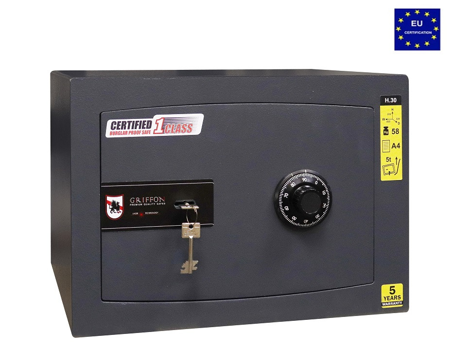Сейф зламостійкий GRIFFON H.30.K.C DARK GREY GRIFFON H.30.K.C — сертифікований зламостійкий сейф, призначений для зберігання й надійного захисту грошей, ювелірних прикрас, цінних паперів, документів від несанкціонованого доступу. Сейф надійно закривається на два типи замка — ключовий і кодовий. Сертифікований по I класу опору до злому EN 1143-1. Захисний шар корпусу — фортифікаційний бетон завтовшки 25 мм. Металеві двері завтовшки 14 мм. Система замикання ригельна система тристоронньої дії (4 хромованих активних обертових ригелі, діаметр ригеля 25 мм). Анкерні вузли для кріплення сейфа до підлоги та стіни. Колір сейфа — темно-сірий (RAL 7016). Зовнішні розміри (висота х ширина х глибина) – 310 x 435 x 324 мм. Внутрішні розміри (висота х ширина х глибина) – 263 x 386 x 242 мм. Вага – 58 кг. Об’єм, л – 25. Кількість полиць – 1 шт. Тип замка – Ключовий сейфовий замок STUV (Німеччина), сертифікат класу VDS 1, механічний кодовий сейфовий замок LaGard (США) класу VDS 1. Тип покриття — порошкове. Гарантия на сейф — 5 років. Гарантія на замок — 1 рік. Виробник – Паритет-К, Україна. Компанія «Паритет-К» — лідер ринку України з виробництва та продажу сейфів і засобів для безпечного зберігання цінностей. З 1992 року компанія виробляє продукцію високої якості для потреб європейського та українського споживача. Якість продукції відповідає високим міжнародним стандартам ISO 9001 Компанія «Парітет-К» — єдиний в Україні серед виробників сейфів і засобів для безпечного зберігання член Асоціації Європейських систем безпеки ESSA. Виробництво та постачання єдиної продукції для ринку Європи й України Продукція проходить сертифікаційні випробування в Європі. Сертифікація продукції відбувається згідно з європейськими стандартами EN 1143-1, EN 14450, EN 15659 У виробництві застосовуються передові технічні та конструкторські рішення власним конструкторським бюро «Парітет-К» має унікальні запатентовані розробки у виробництві сейфів і заввишки банківських сховищ