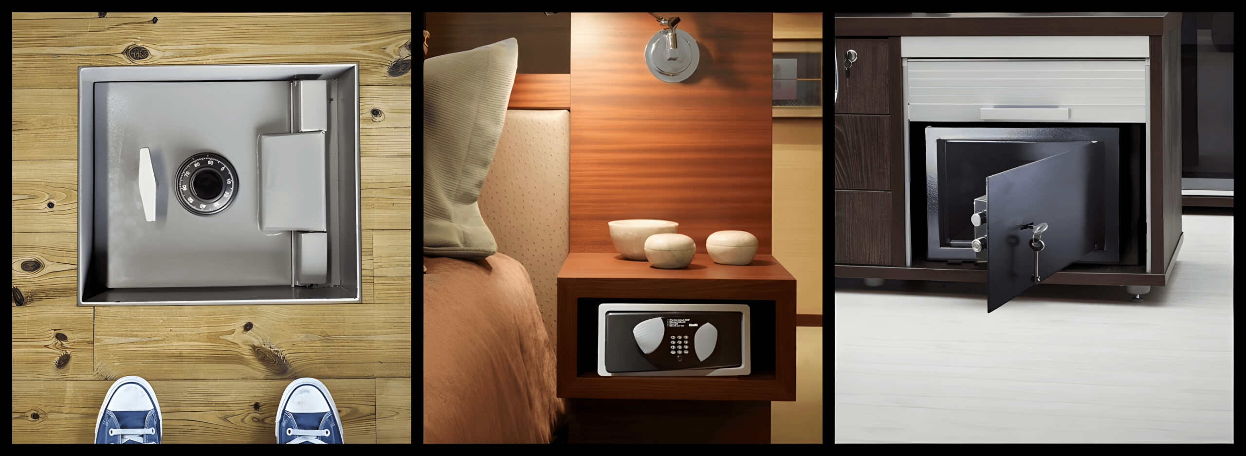 Якщо сейф невеликий, то його простіше розмістити приховано. У книжковій шафі, гардеробній, під ліжком, у нижньому відсіку приліжкової тумбочки або під столом, закріпивши його анкерами. Якщо у вас приватний будинок, то можете вбудувати сейф у стіну або підлогу.